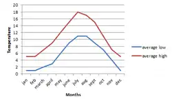 The graph on the right shows yearly average high and low temperatures in Barugh. Compared to the rest of the United Kingdom, the average temperatures are lower in Barugh.[16] This could be because Barugh is in the North of the UK where Temperatures are colder. Barugh is just south of the North York Moors National Park.