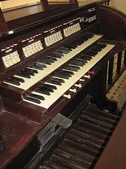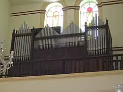 The E.F. Walcker organ is composed of 17 stops spread among two manual keyboards, each with 61 keys, and a keyboard played with the feet to produce low bass notes. All the keyboards are in a console, which is separated and put in front of the organ with sight of the altar. These keyboards control 1,020 pipes of varied length and calibre.[8] The organ is an orchestra in and of itself, with instruments like trumpets, bombards, oboes, clarinets, flutes and human voices. It is made of varnished and sealed mahogany. The organ works with an electrical fan and a 14-volt dynamo providing continuous current to the motor.[8] Of the 32 organs in Antioquia, the basilica's is the eighth largest in area and volume.[9]