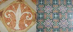 The tiling of the presbytery and of the reserve altar, in other words the walls of the church, is in multicoloured marble. Its design is similar to that of the Church of Nuestra Señora del Rosario, with marble inlays combined with drawings of fleurs-de-lis, except the terraces which in the basilica are made of white marble.[8] The paving of the naves is done with coloured cement (also known as hydraulic tile), which has striking forms and colours. This type of tiling was very common between the beginning and middle of the 20th century.