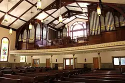 In 1948, the congregation purchased a Wurlitzer electronic organ for $4,500.00 to replace the old pipe organ. The St. Cecilia's Guild started a weekly bingo to raise the money for a new Kilgen pipe organ, which cost $31,832.48.[2] The interior of the church was extensively renovated from 1950 to 1951 and the front portion of the current rectory was completed the following year. The parish completed a new convent in 1958 which eventually became the Cenacle Retreat House. The present pews were installed in the church in 1958 for $11,429.[2] Artist John L. Baker painted the sanctuary ceiling with a vibrant, complex linear painting in 1966.