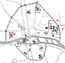Garrisoned by a captain, a knight, eight squires and ten crossbowmen, the Bastille was encircled with ditches fed by the River Seine, and faced with stone.[12] The fortress had four sets of drawbridges, which allowed the Rue Saint-Antoine to pass eastwards through the Bastille's gates while giving easy access to the city walls on the north and south sides.[13] The Bastille overlooked the Saint-Antoine gate, which by 1380 was a strong, square building with turrets and protected by two drawbridges of its own.[14] Charles V chose to live close to the Bastille for his own safety and created a royal complex to the south of the fortress called the Hôtel Saint-Pol, stretching from the Porte Saint-Paul up to the Rue Saint-Antoine.[15][B]