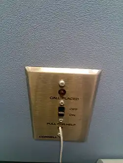 A bathroom emergency pullstring is a cord found in some bathrooms and restrooms that can be pulled in the event of an emergency suffered by the bathroom's user, such as a fall or lock-in. They are often found in the bathrooms of healthcare facilities, such as hospitals, nursing homes, assisted livings, and doctor's offices, in places frequented by senior citizens or disabled people, such as senior centers, places of worship, or in senior housing, and in other places where trouble may arise, such as the lavatories on aircraft or trains and in hotels.[1] These pull cords are part of a communication system where, when pulled, a light outside the bathroom flashes, which notifies a nurse or someone who is around to help the person in need. In addition to the flashing light, a buzzer or tone can be heard. Ideally, they are placed near the toilet or shower.[2]