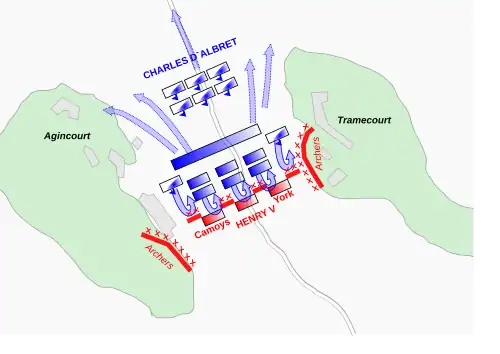 The French vanguard and main battle numbered respectively 4,800 and 3,000 men-at-arms.[51] Both lines were arrayed in tight, dense formations of about 16 ranks each, and were positioned a bowshot length from each other.[52] Albret, Boucicaut and almost all the leading noblemen were assigned stations in the vanguard.[53] The dukes of Alençon and Bar led the main battle.[54] A further 600 dismounted men-at-arms stood in each wing, with the left under the Count of Vendôme and the right under the Count of Richemont.[55] To disperse the enemy archers, a cavalry force of 800–1,200 picked men-at-arms,[56] led by Clignet de Bréban and Louis de Bosredon, was distributed evenly between both flanks of the vanguard (standing slightly forward, like horns).[57] Some 200 mounted men-at-arms would attack the English rear.[35][d] The French apparently had no clear plan for deploying the rest of the army.[35] The rearguard, leaderless, would serve as a "dumping ground" for the surplus troops.[60]