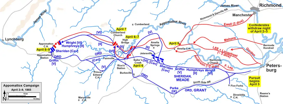 En route to the station, on April 6 at Sailor's Creek, nearly one fourth of the retreating Confederate army was cut off by Sheridan's cavalry and elements of the II and VI Corps. Two Confederate divisions fought the VI Corps along the creek. The Confederates attacked but were driven back, and soon after the Union cavalry cut through the right of the Confederate lines. Most of the 7,700 Confederates were captured or surrendered, including Lieutenant General Richard S. Ewell and eight other general officers.[4] The delay prevented Lee from reaching the Appomattox station until late afternoon on April 8, allowing Sheridan to reach the station ahead of the Southerners that evening, where he captured Lee's supplies and obstructed his path.[5]