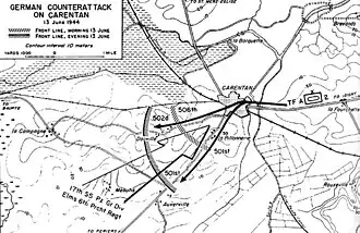 At 4:30 p.m., sixty tanks from Combat Command A of the 2nd Armored Division, accompanied by infantry of the 29th Division,[3] counterattacked southwest from Carentan,[3] inflicting severe casualties on the Germans and forcing them to withdraw with the loss of four tanks.[4] The American victory led to the linkup of forces from Utah and Omaha Beaches, creating a secure lodgement area for further American operations.