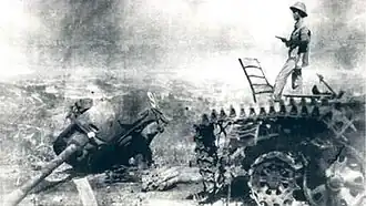 The situation was more endurable for the 42nd Army, as by 22 February they had taken Phục Hòa, Thất Khê, Quảng Uyên, and Đông Khê, penetrating some 25 km into Vietnamese territory from Shuikouguan.[14] However, it had failed to meet the 24-hour schedule to obtain the objectives around Cao Bằng, due to difficult terrain and frequent Vietnamese ambushes. The PLA 121st Division had to march for six days to arrive their destination at Khau Đồn, southwest of Cao Bằng.[15] Previously, on 20 February, a Chinese tank unit from the 42nd Army leading the advance into Bắc Sơn had been intercepted and lost a number of tanks to Vietnamese anti-tank missiles; the force had only survived after receiving reinforcements from its parental unit.[14]