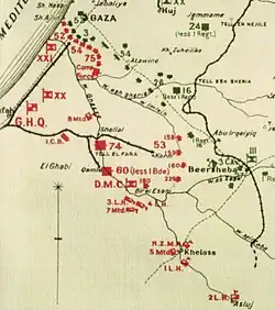 While the XXI Corps continued to hold the front line south of Gaza, extending eastwards from the Mediterranean Sea, the XX Corps and Desert Mounted Corps held the Wadi Ghazzeh and eastwards. On 21 October the XX Corps' 60th (London) Division defended the Shellal to Karm area with the 53rd (Welsh) Division on their left, while the front line extending into No Man's Land was defended by the Australian Mounted Division based at Tel el Fara with the Anzac Mounted Division in reserve at Abasan el Kebir. During the evening of 21 October, the 179th Brigade (60th Division) and the 2nd Light Horse Brigade (Anzac Mounted Division) moved down the Wadi Ghazzeh to Esani, to develop the water supply in preparation for the advance to Beersheba.[11][12]