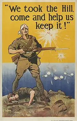 The assault resumed on 27 August and further progress was made up the slope, but the summit of the hill was still held by the Ottomans.[14] On the evening of 27 August 1915, the 9th Light Horse Regiment, of the Australian 3rd Light Horse Brigade, were sent in as reinforcements. One wave of 75 men led by the new commander, Lieutenant Colonel Carew Reynell, lost its way and was caught in the open by Ottoman machine guns, with many soldiers and Reynell being killed.[15] The 10th Light Horse Regiment was committed to the fighting,[16] and on 28 August, some trenches at the summit were captured but the Ottomans clung to the vital northern face which overlooked Suvla. Attacking and counter-attacking continued until this final assault on Hill 60 ended on 29 August 1915.[17]
