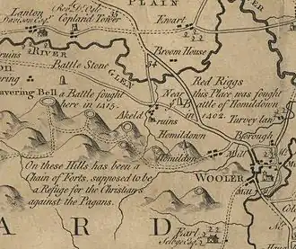 The site of the battle, Humbleton Hill, is now located within the Northumberland National Park. The hill contains the remains of an Iron Age hillfort at the summit, built some 1,500 years before the battle. During the medieval period the sides of the ruined fort were apparently used for summer settlements and sheep shelters.