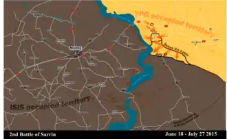 Following nearly two months of a stalled earlier offensive, YPG-led fighters renewed offensive operations on Sarrin on 18 June 2015, followed by a full-fledged operation on 1 July, after ISIL's Kobanî massacre.[17] On 4 July, the town of Sarrin was fully besieged by YPG and FSA forces, as well as the village of Khirbat al-Burj and the Sarrin Grain Silos, both located north of Sarrin.[18] On 12 July, ISIL forces managed to break the sieges and reestablish a supply line to Sarrin, after receiving reinforcements.[19] However, on July 24, YPG and Free Syrian Army forces reestablished the siege of Sarrin,[20] with the sieges of the Sarrin Grain Silos and Khirbat al-Burj being fully re-established by the next day.[21] On 27 July, YPG-led forces fully captured Sarrin and the surrounding region,[1][2][3][4] including 25 surrounding villages and 20+ farmlands,[5] and the YPG declared the end of their offensive.[22]