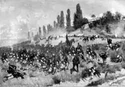 After 5pm the tide of battle turned again, as General Battaile's 2nd Division attacked with 15 battalions near Stiring and Spicheren, breaking the Prussian lines and pushing them back almost to Saarbrücken.[12] If Frossard had continued these counter-attacks he might have won the battle: but because reserves had not arrived, Frossard waited and reinforced his left flank, believing that he was in grave danger of being outflanked because German soldiers under General Adolf von Glümer were spotted in Forbach. Frossard stopped his successful attack and around 7pm wired headquarters that he would have to retreat back to the heights to avoid being outflanked. They were pressed by a combination of overlapping infantry and artillery attacks. Frossard's troops started an orderly retreat from Rotherberg Hill and Stiring, though by some reports some fled in panic, with 3,000 arriving in Strasburg without arms.[11] The French rear guard resisted strongly so there was bloody house to house fighting in Forbach and Stiring.[13] Alvensleben's infantry charge with more than 5000 men overran the French rear guard at dusk, thus gaining control of the Rotherberg Hill. Instead of continuing to defend the heights, Frossard retreated in an orderly fashion to the south. By 9 o'clock, the Prussians occupied the entire Spicheren plateau. They celebrated with a salute of one hundred and one guns.[9]