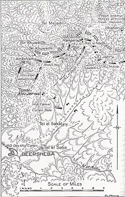 On the right of the Ras en Naqb position, the 2nd Light Horse Brigade continued fighting towards Edh Dhahriye on the main road north from Beersheba to Hebron and Jerusalem. The brigade was deployed on a front of several miles, sending patrols round the Ottoman flank to within 1 mile (1.6 km) of the road, 2 miles (3.2 km) north of Edh Dhahriye, from where they could see the busy motor traffic heading towards Hebron and Jerusalem. However, a general advance, which began at 10:15, was unable to make any gains because the brigade was too thinly stretched over a wide area. This attack was not pressed, but a couple of days' supply of water was found.[58][84]