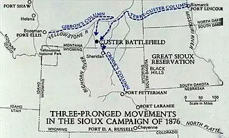 Col. John Gibbon's column of six companies (A, B, E, H, I, and K) of the 7th Infantry and four companies (F, G, H, and L) of the 2nd Cavalry marched east from Fort Ellis in western Montana on March 30 to patrol the Yellowstone River. Brig. Gen. George Crook's column of ten companies (A, B, C, D, E, F, G, I, L, and M) of the 3rd Cavalry, five companies (A, B, D, E, and I) of the 2nd Cavalry, two companies (D and F) of the 4th Infantry, and three companies (C, G, and H) of the 9th Infantry moved north from Fort Fetterman in the Wyoming Territory on May 29, marching toward the Powder River area. Brig. Gen. Alfred Terry's column, including twelve companies (A, B, C, D, E, F, G, H, I, K, L, and M) of the 7th Cavalry under Lt. Col. George Armstrong Custer's immediate command,[31] Companies C and G of the 17th Infantry, and the Gatling gun detachment of the 20th Infantry departed westward from Fort Abraham Lincoln in the Dakota Territory on May 17. They were accompanied by teamsters and packers with 150 wagons and a large contingent of pack mules that reinforced Custer. Companies C, D, and I of the 6th Infantry moved along the Yellowstone River from Fort Buford on the Missouri River to set up a supply depot and joined Terry on May 29 at the mouth of the Powder River. They were later joined there by the steamboat Far West, which was loaded with 200 tons of supplies from Fort Abraham Lincoln.[32]