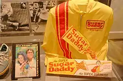 King entered the court in the style of Cleopatra, on a feather-adorned litter carried by four bare-chested muscle men dressed in the style of ancient slaves.[5] Riggs followed in a rickshaw drawn by a bevy of models.[22] Riggs presented King with a giant Sugar Daddy lollipop, and she responded by giving him a squealing piglet,[23][24] symbolic of male chauvinism.[2] Riggs was given $50,000 ($354,000 today) to wear a yellow Sugar Daddy jacket during the match, which he took off after three games. Riggs also placed many bets on and invested money in the match.[25][23]