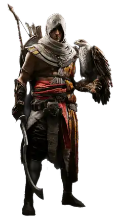 The character's name Bayek is a play on the Egyptian hieroglyphic word for falcon or vulture, in line with a longstanding tradition of naming protagonist characters in the series after birds of prey.[1][2] Bayek shares a symbiotic relationship with his eagle, Senu, who aids him in reconnaissance.[1][3] Senu is considered to be the living precursor to the series’ Eagle Vision, and can be upgraded to distract and attack enemies.[1] For the majority of the game, Bayek is not an Assassin but a Medjay, a well-known and respected man in ancient Egyptian society, and as such there is less emphasis on him to lurk in the shadows or blend in with crowds compared to previous Assassin's Creed protagonists.[4][5] As the player character, Bayek also serves as a lens through which players could understand the importance of religion and ritual daily life in ancient Egypt, and the larger societal issues at play in Ptolemaic Egypt such as class conflict between ethnic Greeks and native Egyptians.[4][6] Bayek's narrative journey also reveals the origins of staple traditions in the series, like the feather ritual, the cut finger, and the leap of faith.[1]