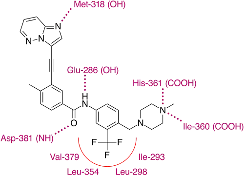 X-ray crystallographic analysis of ponatinib and T315I Bcr-Abl mutated kinase display that the imidazo[1,2b]pyridazine core rests in the adenine pocket of the enzyme. The methylphenyl group occupies a hydrophobic pocket behind I315, the ethynyl linkage forms favorable van der Waals interactions with the amino acid and the trifluoromethyl group binds to a pocket induced by the inactive conformation kinase. Also in the conformation of the kinase that ponatinib rests in, additional favorable van der Waals interactions between the drug and Tyr-253 and Phe-382. Five hydrogen bonds are generated, with the backbone of Met-318 in the hinge region, with the backbone of Asp-381, with the side chain of Glu-286 and the protonated methylpiperazine with the backbone-carbonyl atoms of Ile-360 and His-361.[30]