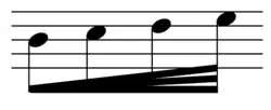 Feathered beaming shows a gradual change in the speed of notes. It is shown with a primary straight beam and other diagonal secondary beams (that together resemble a feather, hence the name). These secondary beams suggest a gradual acceleration or deceleration from the first note value within the feathered beam to the last. (A beam getting wider from left to right shows acceleration.) The longest value possible to show being the eighth note (quaver). When the number of notes played is not of interest, but rather the effect of acceleration or deceleration, an approximate number of headless stems are used. To ensure clarity, sometimes the number of notes within the beam, or the duration of the total beamed notes, is shown above the music, as is done with tuplets.[5]
