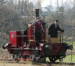 Locomotion No. 1 is a replica of an original locomotive which was designed by George Stephenson and built in 1825 for the Stockton and Darlington Railway, which made it the first steam locomotive to carry passengers on a public rail line. The Beamish replica was completed in 1975 for the 150th anniversary of the S&DR. The original survives as a static exhibit, having eventually become part of the National Collection held by the National Railway Museum, who have placed it on long-term loan to Head of Steam (a museum on the route of the S&DR).[6][7] This locomotive is currently out of use as its boiler certificate has expired. It is currently on static display at the National Railway Museum Shildon and is awaiting overhaul.
