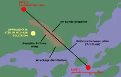 Bearskin Flight 362 left Red Lake Airport at 1:00 PM CDT en route to Sioux Lookout on an instrument flight rules flight. While approximately 55 km (34 mi) north of the Sioux Lookout Airport, the flight received clearance from Winnipeg Area Control Centre to begin an approach who advised the Sioux Lookout FSS (flight service station) of the incoming flight at 1:15 PM. Bearskin Flight 362 intentionally waited 70 seconds to contact the Sioux Lookout FSS in order to allow them to get out of the clouds and receive clearance to change to visual flight rules. During this time, Air Sandy Flight 3101, en route to Red Lake, took off from Sioux Lookout Airport and reported clear of the Sioux Lookout Control Zone. Bearskin Flight 362 finally made contact with FSS at 1:27 PM while 25 km (16 mi) away from the airport. Neither planes contacted FSS or ACC after this point. One minute later while giving an airport advisory about Bearskin Flight 362, the flight service specialist overhead an Emergency Locator Transmitter release a signal over the emergency frequencies.[1]: 1 With both planes set on a collision course with a closing speed of 400 knots, at 1:28 roughly 3.5 seconds prior to impact, the pilot of Air Sandy Flight 3101 spotted Flight 362 and began a steep left turn in an effort to avoid it. However it was too late and the right wing of Air Sandy Flight 3101 made contact with the nose and right propeller of Bearskin Flight 362 at a 45º angle. As Flight 362's propeller splintered and the engine flew off, Air Sandy's right wing continued further into the other aircraft, and sliced off Flight 362's right wing, destroying itself in the process. The wings from both aircraft contained fuel cells which combusted upon impact leaving both planes on fire as they experienced an uncontrollable vertical descent into the ground.[1]: 1–13