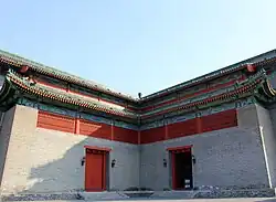 The Southeast Corner Tower was built from 1436 to 1439 and is a major state-protected historical site.[1] The tower, which rises 29 m (95 ft) in height with 144 archery windows, is the largest corner tower still standing in China.[8] The tower could house 200 soldiers and has ramps for soldiers and horses.[8] During the Qing Dynasty, bannerman of the Plain Blue Banner were stationed at the corner tower.[9] During the Boxer Rebellion of 1900, the tower was attacked and captured by the Eight-Nation Alliance.[8] It was known by Westerners as the Fox Tower.[10] Graffiti carved by the invaders are preserved inside the tower. The corner tower was restored in 1983 and became a tourist site. Inside the tower is an exhibit on the history of the city's Ming-era walls. The Red Gate Gallery, a privately managed, non-profit contemporary art gallery opened in 1991 inside the tower and operated for over two decades before moving to the 798 Art Zone.[8] In 2003, the Southeast Corner Tower became part of the Ming City Wall Relics Park.