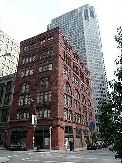 The building is a seven-story commercial building of brick and red sandstone, with three-story arcades rising from the ground-level storefronts.[1] The building originally was built with six stories, while a seventh was added in the same style as the lower levels in 1919 to meet rising demands for space. In 1940, a limestone sheath covered the original storefronts after the building was purchased by S.G. Adams.[1] The eastern wall of the building is blank brick and rises above a neighboring four-story building. The roof is flat, while a parapet wall surrounds the building on all sides.