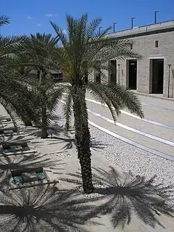 The overall concept was for the design, which includes a larger 65-acre (26 ha) site that includes a road and an interchange in addition to the 5-acre (2.0 ha) Central Garden, was for it to relate strongly to the surrounding landscape.[2] Plants common to the area were selected based on their regional presence. The gradual elevation change (approximately 15 feet (4.6 m)[3]) within the garden is meant to symbolize the ascent from Tel Aviv to Jerusalem while also accommodating the practical requirement of the connecting various elevations of the parking garages with adjacent roads. Aronson symbolizes the Mediterranean coastline through the formal arrangement of materials like stone (a local limestone) and stainless steel. Gravel is used to represent the beaches of the western border of Israel, and a grid of palm trees recalls the seaside promenades that are growing in popularity within Israel. The grid arrangement also references the agricultural plantings of palm trees in the region. With the shift in elevation through the site comes a change from paved surface to planted areas of wheat fields, grasses, and orange groves. Small channels of water run through the garden, using a traditional technique for areas prone to rapid evaporation and indicating the need for human intervention in hydrating the arid landscape. The uppermost terrace contains a grove of olive trees, a tree common to the Judean Mountains around Jerusalem and the highest elevations within the country. Shlomo Aronson and project architect Barbara Aronson intended for the garden to be an abstraction of the region that allows visitors to gain a “deeper feeling of place”[4] regardless of religious or political affiliations.