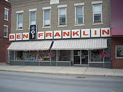 Ben Franklin is a chain of five and dime and arts and crafts stores found primarily in small towns throughout the United States, last owned by Promotions Unlimited of Mount Pleasant, Wisconsin.[1] They are organized using a franchise system, with individual stores owned by independent proprietors. It was perhaps the first retail franchise, starting in 1927.[2] They are named after Benjamin Franklin, taking a cue in their merchandise offerings from Franklin's saying, "A penny saved is a penny earned." Although Promotions Unlimited filed for bankruptcy in 2017, a number of stores continue to operate under the Ben Franklin name.