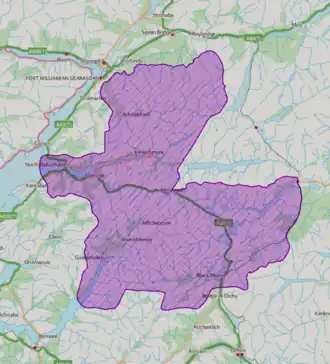 Ben Nevis and Glen Coe is a national scenic area (NSA) covering part of the Highlands of Scotland surrounding Ben Nevis and Glen Coe,[3] in which certain forms of development are restricted. It is one of 40 such areas in Scotland, which are defined so as to identify areas of exceptional scenery and to ensure their protection from inappropriate development.[4] The Ben Nevis and Glen Coe NSA covers 903 km2 (349 sq mi) of land, lying within the Highland, Argyll and Bute and Perth and Kinross council areas. A further 19 km2 (7.3 sq mi) of the NSA are marine, covering the sea loch of Loch Leven.[1][2]