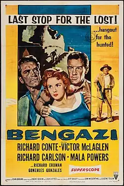 Bengazi is a 1955 American drama film directed by John Brahm and starring Richard Conte, Victor McLaglen, and Richard Carlson.[2]