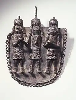 Chiefs and titleholders in Benin wear a variety of brass ornaments as part of their elaborate regalia for palace ceremonies. Most are worn at the left hip, covering the closure of their wrapped skirts. Typically made of brass, they are often worn horizontally and are held in place by large loops located at the top and bottom of the back of the ornament.[2]