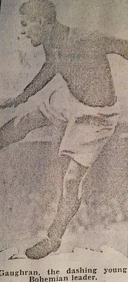 Charlie Harris, the Bohemians' trainer succeeded in inducing him to take up Association Football.[1] Gaughran believed that his rugby training gave him a good grounding for soccer and that "if one could kick an oval ball accurately there should be no great difficulty in learning how to control a round one."[3] After a few games with Bohemians' Leinster League team, he made his debut for their Free State team against Waterford at Kilcohan Park and very soon attracted the attention of a number of cross-channel clubs.