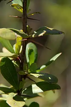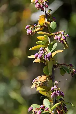 Berberis holstii is a spiny evergreen shrub assigned to the barberry family, with simple leaves, hanging panicles with a few yellow flowers and eventually blackish-blue berries.[1] It is one out of only species of Berberis that grow in the wild in Africa, where it can be found at high altitudes (above 2000 m) in Tanzania, Uganda, Kenya, Ethiopia, Somalia, and Malawi. It is also reported from Yemen and Oman.[2][3] In Malawi it is known as Kayunga, while in Ethiopia it is called Gewo, Yeset af in Amharic, as well as Zinkila, a name also used in the Afar language, and Godxantool in the Somali language.[4][5][6]
