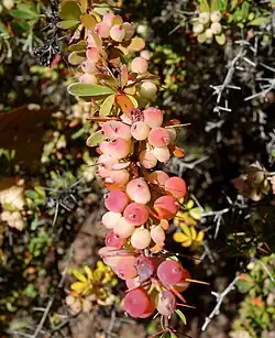 Berberis wilsoniae, Mrs. Wilson's barberry, is a species of flowering plant in the family Berberidaceae. It is native to Tibet, south-central China, and Myanmar, and has been introduced to the North and South Islands of New Zealand.[1] It is a mound-forming, deer-resistant shrub, with blueish-green leaves that turn red in Autumn and yellow flowers that produce translucent pink fruit.[2] A number of cultivars are available.