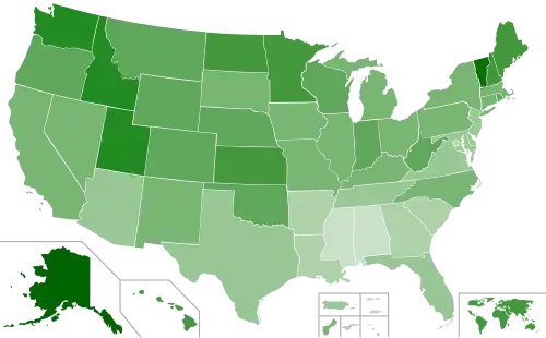 Sanders narrowly lost the February 1, 2016 Iowa Democratic caucuses by 0.25% of the vote (49.59 to Clinton's 49.84).[90] He won the New Hampshire Democratic primary on February 9, 2016, by 22.4% of the vote (60.4% to Clinton's 38.0%), receiving strong support from voters who considered it important to nominate a candidate who is "honest and trustworthy".[91][92] This made him the first self-described democratic socialist and first non-Christian to win a major party's U.S. presidential primary.[93][94][95] In his home state of Vermont, Sanders received 86.1% of the vote, denying Clinton any delegates. He also won "landslide" victories in Washington, Alaska, and Hawaii. On March 8, Sanders pulled off an upset in the Michigan Democratic primary, where polls had favored Clinton by significant margins.[96] Of the 78% of pledged delegates allocated in primaries and caucuses by May 10, 2016, Clinton had won 54% to Sanders's 46%.[97] Of the 715 unpledged delegates or "superdelegates" who voted in the convention in July, Clinton had received endorsements from 505 (71%), Sanders 41 (6%).