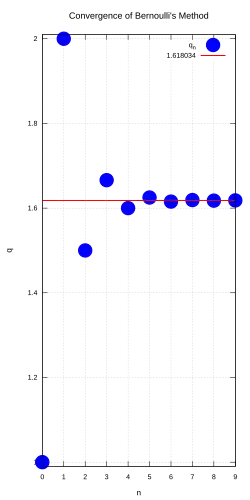 In numerical analysis, Bernoulli's method, named after Daniel Bernoulli, is a root-finding algorithm which calculates the root of largest absolute value of a univariate polynomial.[2][3] The method works under the condition that there is only one root (possibly multiple) of maximal absolute value. The method computes the root of maximal absolute value as the limit of the quotients of two successive terms of a sequence defined by a linear recurrence whose coefficients are those of the polynomial.