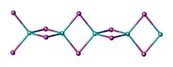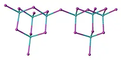 Two forms (polymorphs) of BeCl2 are known. Both structures consist tetrahedral Be2+ centers interconnected by doubly bridging chloride ligands. One form consist of edge-sharing polytetrahedra. The other form resembles zinc iodide with interconnected adamantane-like cages.[4] In contrast, BeF2 is a 3-dimensional polymer, with a structure akin to that of quartz.