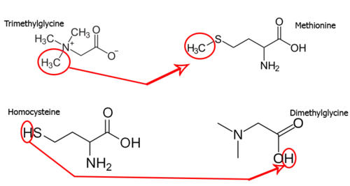 - Trimethylglycine (methyl donor) + homocysteine (hydrogen donor) → dimethylglycine (hydrogen receiver) + methionine (methyl receiver)