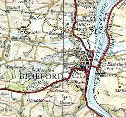 A scheme for building this railway was suggested as early as 1860 with a bridge across the Torridge and stations at Northam, Appledore, Clovelly, Hartland and Bude. With the Bideford, Appledore, and Westward Ho' Railway Act 1866 (29 & 30 Vict. c. ccxxiv) a start was actually made on a line to run to Appledore with a branch to Westward Ho!, however soon after a full 'first sod cutting ceremony' by the Earl of Iddesleigh, the contractors went bankrupt and the project was abandoned.[3] A project to create a 10+1⁄2 miles (16.9 km) branch from Abbotsham Road Station to Clovelly had been put forward by Messrs. Molesworth and Taylor.