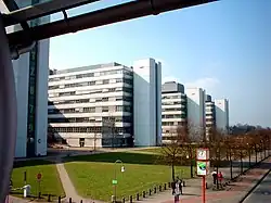The university is located in the west of Bielefeld next to the Teutoburg Forest. The main building, which houses all the faculties and institutes, as well as the large library, is a functional concrete structure, typical of the 1960s. The main building with 154,000 m2 alone is one of the largest structures in Europe.[6]