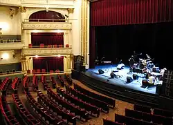 The theater has a capacity of approximately 700, with two balcony levels. There are two loggia levels and three box levels on each side of the building. The stage is 35 feet (11 m) deep and 69 feet (21 m) wide. The theater is decorated with notable Classical Revival elements, which include Corinthian columns supporting the box levels, reclining muse pediments above the top box levels, and grape-and-vine motifs adorning the front of the boxes and balconies.[2]