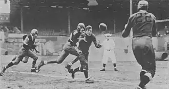 The next season the Bears played in the first ever NFL Championship Game, against the New York Giants, a game started by Hewitt at left end.[14] Hewitt had only one reception for three yards in the game,[15] but was a part of what was described as "the greatest play of the game."[16] In the fourth quarter, with the Bears trailing by five, Hewitt received a pass from Bears quarterback Keith Molesworth, before lateraling to end Bill Karr, who then ran 19 yards for the final touchdown of the game. The Bears won the game 23–21.[16]