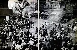 In 1965 Life sent Ray to Asia to cover the war in Vietnam and tensions on the border between Tibet and Sikkim. The cover for August 6 showed the six-inch guns of a light cruiser bombarding Vietcong positions and a photo essay in that issue showed action on an aircraft carrier, including a two-page spread of sailors transferring a 2,000 lb bomb that had been received from a supply ship and another showing crew members from a destroyer checking out a suspicious fishing boat.[3] In October of the same year, Ray was in Sikkim to photograph Chinese Red Army soldiers patrolling the Tibetan border of that Indian province.[17] In 1966 Ray produced a photo essay in a small Ohio town from which a relatively large number of young men had been sent to fight in Vietnam. It included shots of a military funeral for a marine killed in action (shown at right) and photos of six families, standing next to their television sets, each set showing President Lyndon Johnson giving a press conference. In varying degrees they expressed doubts about the war and, as the accompanying text said, "doubted Johnson's optimistic appraisal of Vietnam."[18] Before going to Massillon Ray made a photo essay showing the Watts section of Los Angeles as a follow-up to the previous summer's riots.[19] In 1968 Ray was in Prague taking photographs of the Soviet invasion that brought the Prague Spring to an end.[20] One of the images appeared in a double-page spread in the issue for August 30 (shown at left). The accompanying description said, "Suddenly, unbelievably, Soviet tanks were in the streets of Prague, and the brief idyll of liberation, the brave rebirth of national pride and expectation were at an end... Utterly astounded by the treachery and admonished by their leaders to offer no resistance, the Czech people could only gather with their flags in anguished crowds and hurl threats and a pitiful defiance against the steel of the invaders."[20]
