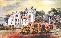 Subsequent owners Czosnowski, after the 1806 conflagration, rebuilt the fortress into a palace, leaving parts of the ruins.[6] Around 1866 Czosnowski was arrested by the tsarist authorities for his participation in the 1863 uprising and the castle was sold at auction. Along with 4,500 acres of land, it was bought by Count Aleksander Woronin, a governor-general and secret counselor and officer for especially important affairs in Kyiv. In 1862–1876 the village was visited by the famous artist Napoleon Orda (1807–1883), who depicted the palace and castle period in his drawings, when the palace had not yet been rebuilt and the old castle had not been completely destroyed. The current palace was built in the 17th century, and its appearance is the result of a major reconstruction in neo-Gothic style in the late 19th century.[7] The new palace was almost three times larger than the previous one. Of course, at that time the stone ruins of the old castle were destroyed, hindering construction.[3] Before World War II, the State Secondary Agricultural School operated here.[8] Today it houses a forestry technical college[7] and what remains of the castle are the defensive walls, ditches and ramparts.[3][4]