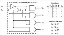 In digital electronics, a binary decoder is a combinational logic circuit that converts binary information from the n coded inputs to a maximum of 2n unique outputs. They are used in a wide variety of applications, including instruction decoding, data multiplexing and data demultiplexing, seven segment displays, and as address decoders for memory and port-mapped I/O.