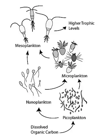 The microbial loop describes a trophic pathway in the marine microbial food web where dissolved organic carbon (DOC) is returned to higher trophic levels via its incorporation into bacterial biomass, and then coupled with the classic food chain formed by phytoplankton-zooplankton-nekton. The term microbial loop was coined by Farooq Azam, Tom Fenchel et al.[118] in 1983 to include the role played by bacteria in the carbon and nutrient cycles of the marine environment. In general, dissolved organic carbon is introduced into the ocean environment from bacterial lysis, the leakage or exudation of fixed carbon from phytoplankton (e.g., mucilaginous exopolymer from diatoms), sudden cell senescence, sloppy feeding by zooplankton, the excretion of waste products by aquatic animals, or the breakdown or dissolution of organic particles from terrestrial plants and soils.[119] Bacteria in the microbial loop decompose this particulate detritus to utilize this energy-rich matter for growth. Since more than 95% of organic matter in marine ecosystems consists of polymeric, high molecular weight (HMW) compounds (e.g., protein, polysaccharides, lipids), only a small portion of total dissolved organic matter (DOM) is readily utilizable to most marine organisms at higher trophic levels. This means that dissolved organic carbon is not available directly to most marine organisms; marine bacteria introduce this organic carbon into the food web, resulting in additional energy becoming available to higher trophic levels.[120]