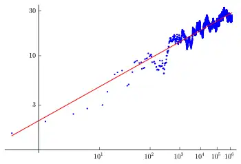 A plot, in blue, of for the curve y2 = x3 − 5x as X varies over the first 100000 primes. The X-axis is in log(log) scale -X is drawn at distance proportional to from 0- and the Y-axis is in a logarithmic scale, so the conjecture predicts that the data should tend to a line of slope equal to the rank of the curve, which is 1 in this case -that is, the quotient as , with C, r as in the text. For comparison, a line of slope 1 in (log(log),log)-scale -that is, with equation - is drawn in red in the plot.