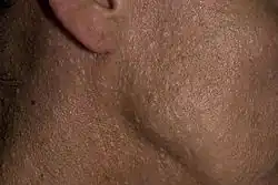 Birt–Hogg–Dubé syndrome affects the skin and increases the risk of tumors in the kidneys and lungs. The condition is characterized by multiple noncancerous, dome-shaped tumors of the hair follicles (fibrofolliculomas), particularly on the face, neck, and more rarely, the upper chest.[3] The fibrofolliculomas are generally described as having an opaque white color[4] or a yellowish tone[5] and have a waxy, smooth texture.[4] The tumors are always found on and around the nose and on and behind the outer ear. Typically, they first appear in a person's 20s or 30s, and are found in more than 80% of people with the syndrome above the age of 40.[3] The tumors become larger and more numerous over time.[6] Tumors differ between individuals; they may appear merged in plaques, look similar to a comedo with a plug of keratin, or include epidermoid cysts. A large number of tumors on the face can be associated with hyperseborrhea (abnormally elevated sebum production).[3] The presence of fibrofolliculomas on a person's face can cause significant psychological distress.[7]