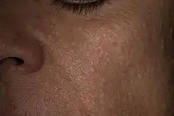 | The characteristic fibrofolliculomas of Birt–Hogg–Dubé syndrome seen on a person's face. | |
