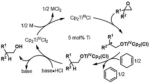 Bis(cyclopentadienyl)titanium(III) chloride effects the anti-Markovnikov opening of epoxides to a free radical intermediate and is tolerant of alcohols and some basic nitrogen functional groups, however it is sensitive to oxidizing functional groups such as nitro groups.[8] As can be seen in the above illustration, subsequent reaction proceeds along a pathway determined by added reagents and reaction conditions:[9]