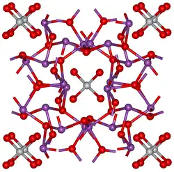 Bismuth silicon oxide or bismuth silicate refers to an inorganic compound of bismuth, silicon and oxygen. The bismuth silicate Bi12SiO20 is most commonly encountered, though others are also known. It occurs naturally as the mineral sillénite and can be produced synthetically by heating a mixture of bismuth oxide and silicon dioxide. Centimeter-sized single crystals of Bi12SiO20 can be grown by the Czochralski process from the molten phase. They exhibit piezoelectric, electro-optic, elasto-optic, photorefractive[4] and photoconductive properties, and therefore have potential applications in spatial light modulators, acoustic delay lines and hologram recording equipment.[1] Bi12SiO20 can be obtained as a whitish powder with band gap of approximately 3.2 eV starting from bismuth subcarbonate and silica in presence of ethyleneglycol.[5] 29Si solid-state NMR is used to prove that the Si(IV) cations are sharing oxygen atoms with the Bi(III) cations. The 29Si chemical shift (δ) in Bi12SiO20 is −78.1 ppm. Unlike bismuth oxide, the presence of the acidic Si(IV) cations avoid the reactivity with CO2.